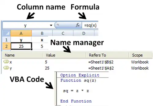 The key feature of spreadsheets is the ability for a formula to refer to the contents of other cells, which may, in turn, be the result of a formula. To make such a formula, one replaces a number with a cell reference. For instance, the formula =5*C10 would produce the result of multiplying the value in cell C10 by the number 5. If C10 holds the value 3 the result will be 15. But C10 might also hold its formula referring to other cells, and so on.