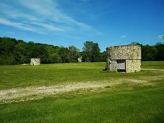 St. Albans Farms Stone Barn, also known as the Stone Dairy Barn, is a historic barn located at St. Albans, Franklin County, Missouri. It was built about 1918, and is a large U-shaped one-story frame building with limestone-faced walls and a steep gable roof. It features round corner towers that are topped with conical roofs. Associated with the barn are a large round tile silo off of each back corner.[2]: 6 Much of the barn has been demolished.