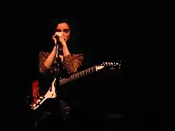 Clark’s music, which features her mezzo-soprano voice,[106][107][108] has been noted for its wide array of instruments and complex arrangements, as well as its polysemous lyrics, which have been described as teetering between "happiness and madness".[31] In response, Clark has said, "I like when things come out of nowhere and blindside you a little bit. I think any person who gets panic attacks or has an anxiety disorder can understand how things can all of a sudden turn very quickly. I think I'm sublimating that into the music."[21] In addition to guitar, Clark also plays bass, piano, organ, and theremin. Her music also often features violins, cellos, flutes, trumpets, clarinets, and other instruments.[109] Her musical style has been characterised as rock,[110][111] pop,[112][113] art rock[114][112] and indie rock,[115][116] incorporating a wide range of influences including experimental rock, chamber pop, electropop, soft rock, and cabaret jazz.[34][117]