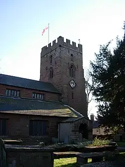 A church was present on the site at the time of the survey for the Domesday Book and it is likely that Saxon churches had previously been there.[3] The base of the tower and the plan of the church date from the 14th century although around 1622 the historian Webb described it as "a fair new church". During the English Civil War the church was badly damaged. In 1643 it was being used as a barracks for the Parliamentarians under Sir William Brereton when it was attacked by Royalists. During the battle the church was set on fire. It continued to be used by the Parliamentarians until 1645 when it was abandoned and left derelict.[4] Apart from the tower the church was completely rebuilt in 1658 by William Barnston. Further restorations were carried out in the 19th and 20th centuries.[4] The 19th-century restoration was carried out by Kelly and Edwards, other than the southeast chapel which was by John Douglas.[5]