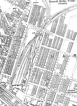 Overall, the station and goods facilities covered 8 acres (3.2 ha), however the passenger section only consisted of one platform with a somewhat rudimentary wooden canopy shelter (compared to the brick-built booking office). This was in stark contrast to the comprehensive goods sidings, weighbridge, travelling crane and large goods shed. Rail access to this complex was from the north-eastern corner via a double track bridge over Standish Street. The line then divided into two, the northern branch proceeding into Pilkington's Cowley Hill Plate Glass Works being purely for goods traffic,[13] the other line running to the east. This crossed the LNWR line at Pocket Nook on a single line viaduct. It was originally intended to be double track, but due to difficulties in obtaining sufficient land and clearances plus rising costs, the viaduct was eventually forced to be completed as a single line structure.