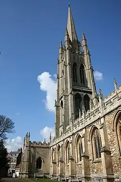 The church is a medieval building. It has the tallest steeple of any medieval parish church in Britain. A recent survey has confirmed the height of the stonework as 287 feet 6 inches (87.63 m) and to the top of the cockerel weather vane as 293 feet 1 inch (89.33 m). It also confirms it as one of the very finest medieval steeples in the country[4]
