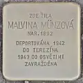 Gertruda Glauberová née Zinner, also called Gertrude or Trude, was born on 24 August 1909 in Hlinsko. Her parents were Ludwig Zinner and Stefanie née Bergmann, also Steffi. She had a sister named Marianna, born on 20 March 1906, later married as Kraus. She married Valtr Glauber (see above). The couple had a son, Karel, born in 1937 (see above). She was arrested, separated from her child and deported to Auschwitz concentration camp. There she was murdered on 16 January 1943.[16]