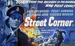 Street Corner (U.S. title Both Sides of the Law; also known as Gentle Arm and The Policewoman) is a 1953 British drama film directed by Muriel Box and starring Peggy Cummins, Terence Morgan, Anne Crawford, Rosamund John and Barbara Murray.[2] It was written by Muriel Box and Sydney Box. While it is not quite a documentary, the film depicts the daily routine of women in the police force from three different angles. It was conceived as a female version of the 1950 film The Blue Lamp.[3]