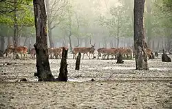 Four protected areas in the Sundarbans are enlisted as UNESCO World Heritage Sites, viz. Sundarbans West, Sundarbans South, Sundarbans East in Bangladesh and Sundarbans National Park in India.[4] The Indian Sundarbans were considered endangered in a 2020 assessment under the IUCN Red List of Ecosystems framework.[5] The most abundant tree species are sundri (Heritiera fomes) and gewa (Excoecaria agallocha). The forests provide habitat to 453 fauna wildlife, including 290 bird, 120 fish, 42 mammal, 35 reptile and eight amphibian species.[6] Despite a total ban on all killing or capture of wildlife other than fish and some invertebrates, there has been a consistent pattern of depleted biodiversity or loss of species in the 20th century, with the ecological quality of the forest declining.[7]