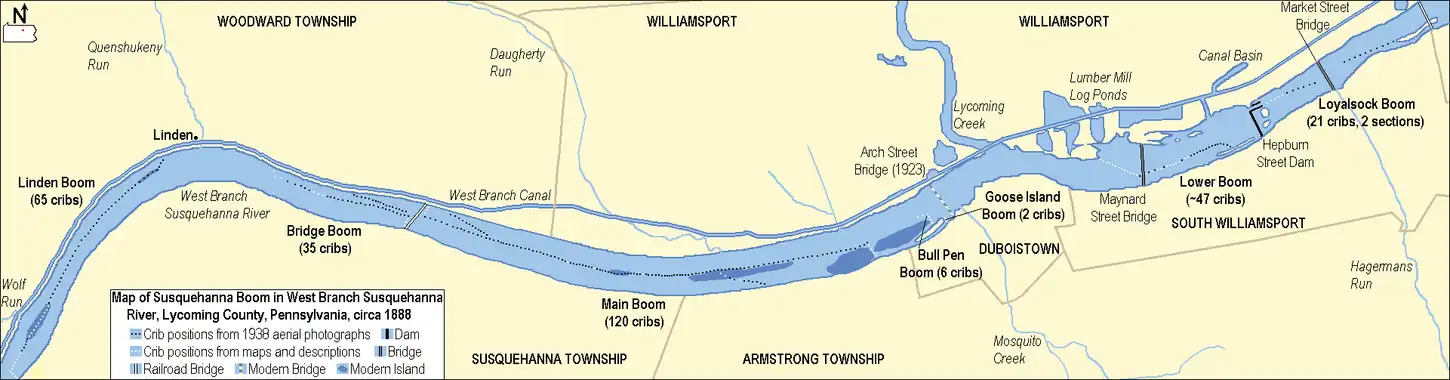 The Susquehanna Boom was a system of cribs and chained logs in the West Branch Susquehanna River, designed to catch and hold floating timber until it could be processed at one of the nearly 60 sawmills along the river between Lycoming and Loyalsock Creeks in Lycoming County, Pennsylvania in the United States. The Susquehanna Boom was originally built under the supervision of James H. Perkins,[1] and operated from 1851 to 1909, when it shut down for lack of timber.[2]
