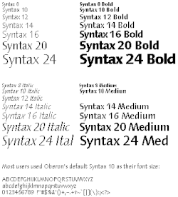 The Syntax font family was chosen by Niklaus Wirth for the Oberon operating system. During part of the period that Oberon was under development, Meier worked in Wirth's group at ETH, developing hand-optimized bitmap versions of the Syntax fonts (this was in the days prior to font anti-aliasing).