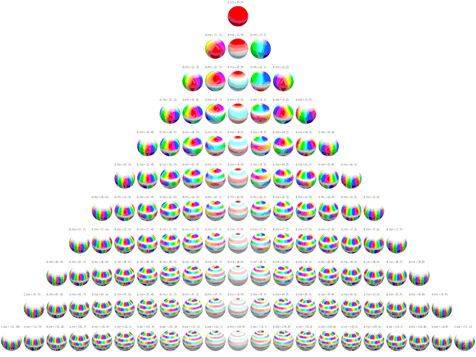 , on the vertical axis. The saturation of the color at any point represents the magnitude of the spherical harmonic and the hue represents the phase.
