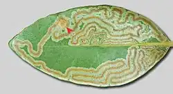 Tamala borbonia leaf with leaf mines by larvae of the moth Phyllocnistis hyperpersea.
