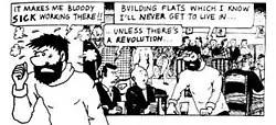 In Tintin in the Land of the Soviets, the Bolsheviks were presented as villains. Hergé drew on Moscow Unveiled, a work given to him by Wallez and authored by Joseph Douillet, the former Belgian consul in Russia, that is highly critical of the Soviet regime, although Hergé contextualised this by noting that in Belgium, at the time a devout Catholic nation, "anything Bolshevik was atheist".[55] In the story, Bolshevik leaders are motivated by personal greed and a desire to deceive the world. Tintin discovers, buried, "the hideout where Lenin, Trotsky, and Stalin have collected together wealth stolen from the people". In 1999, the issue of Tintin's politics was the subject of a debate in the French parliament;[95] this event prompted the British weekly newspaper The Economist to publish an editorial on the matter.[96]