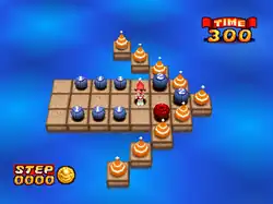 The game was independently re-developed for the Nintendo 64 by Realtime Associates and game designer Scott Kim.[3] In the early days of the games production it was titled "Charlie Blast's Challenge".[4][3][6] Besides changing the graphics, a four-player versus mode was also added wherein players can control Charlie or one of three other characters and must conquer as much of the land as possible with one's own bomb blasts. The multiplayer mode includes several bombs not featured in the main solo mode, like a freeze bomb, which when lit, will encase the other player(s) in blocks of ice, and a rainbow bomb, which is capable of exploding an entire row or column that the bomb is facing.