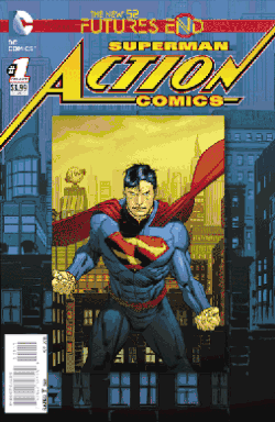 ![]() An example of "The New 52: Futures End" 3D lenticular covers, highlighting the change of image from present to future, with the cover of Action Comics: Futures End #1 (September 2014 DC Comics). Art by Lee L. Weeks. | |