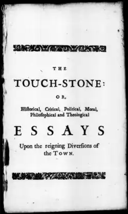 - Ralph, James (1728). The Touch-Stone; or, Historical, Critical, Political, Philosophical, and Theological Essays on the Reigning Diversions of the Town. Published anonymously; modern scholarship attributes the work to Ralph. London: Printed, and sold by the booksellers of London and Westminster.