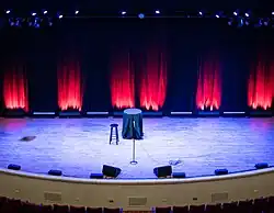 The auditorium has a parterre-level orchestra and a single balcony, with a small stage behind the proscenium arch.[25][26] The auditorium has a seating capacity of 1,495.[27] Every effort was taken to ensure that no seats had obstructed views,[26][28] which led to the Town Hall's long-standing mantra "Not a bad seat in the house".[4] The balcony is cantilevered from the structural framework, which obviated the need for columns that blocked audience views.[22] The balcony has a loge, or theatrical box.[19][26] The front of the balcony contains a wrought-iron balustrade. The auditorium retains most of its original wicker seat designs, except for the loge, where modern theatrical seats have been installed.[29] The original seats were capable of unusually high levels of acoustic absorption; they were replaced in the 1980s by seats with similar acoustic qualities.[30] The writer Harold C. Schonberg wrote that only the seating on the balcony had good acoustics, as the balcony's presence muffled the sounds at orchestra level.[31]