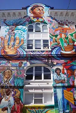 A mural titled MaestraPeace (1994) covers the outside of The Women's Building as well as the interior entrance hall and stairway. It was painted by women artists, including Juana Alicia, Miranda Bergman, Edythe Boone, Susan Kelk Cervantes (cofounder of Precita Eyes Muralists Association), Meera Desai, Yvonne Littleton, and Irene Perez, along with their helpers and volunteers.[16] It features images of female icons from history and fiction, and the names of more than 600 women written in calligraphy.[17] According to the San Francisco Women's Center, "This spectacular mural is a culmination of a multi-cultural, multi-generation collaboration of seven women artists, and a colorful work of art that sings to our community."[2]