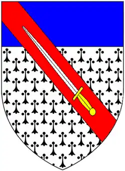 Arms of Gladwin: Ermine, a chief azure over all a bend gules charged with a sword argent hilt and pomel or. Granted by the College of Arms in 1660[1]