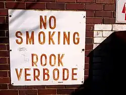South Africa has strong anti-tobacco laws to protect the health of the general public. Under national law, the sale of tobacco to minors is not allowed, and the advertising and promotion of tobacco products anywhere is strictly prohibited. Cigarette packaging features health warnings. Furthermore, smoking is prohibited in most indoor places, all partially-enclosed public spaces, as well as some outdoor areas, as well as anywhere where there are persons under the age of 18 present (including inside private vehicles). There are strict penalties for both smokers and venue operators who violate the smoking laws, including fines of up to R50,000.[3][4][5][6] South Africa has a national agency for tobacco control. The country also launched a free line (011 720 3145) for people to call for assistance with quitting smoking.[7]