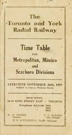 On November 1, 1922, operation of the T&YRR was taken over by Hydro Electric Power Commission of Ontario and run as the Hydro-Electric Railways: Toronto and York Division.[2] Hydro made improvements to both the Metropolitan and Mimico lines.[6]