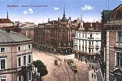 The first line was 36.5 km long and connected Gliwice with Piekary Śląskie through Zabrze, Chebzie, Chorzów and Bytom, another connected Katowice and Siemianowice. After four years, in 1898, Kramer & Co. was chosen to start electfication on Katowice Rynek (Kattowitz, Ring) - Zawodzie line, after which Schikora & Wolff completed electrification of four additional lines.[5] In 1912, the first short 4 ft 8+12 in (1,435 mm) standard gauge line was built in Katowice.[6] In 1913, a separate standard gauge system connecting Beuthen O.S. (Bytom) with suburbs and villages west of the city was launched.[6]