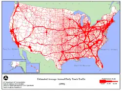 Estimated average annual daily truck traffic for Interstate and major US Highways (1998)