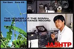 He attended Konan University, Department of Literature at the age of 18. Graduating in 1968, he moved to Minami-daito Island to establish the longest radio traffic record in the world. Then he successfully made the radio contact with PY5BAB from Curitiba where 19997.05 km away from Minami-daito Island is. As a result, he had become the new world record holder of the 50 MHz and it was pressed in the 1984 Guinness Book.[2]