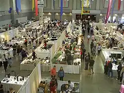 The first Tucson Gem and Mineral Show was held in an elementary school in 1955 and shortly thereafter moved to a Quonset hut at the Tucson Fair Grounds. In 1973, it moved into the Tucson Community Center, first occupying the North Exhibit Hall, then expanding into the Arena and upper Arena concourse. After the completion of the new facility in 1990, which is now called the Tucson Convention Center, the Tucson Gem and Mineral Show now occupies the Arena, Exhibition Halls A-B-C, Galleria and Ballrooms. Katherine Rambo estimates that between 1996 and 2010 there was an average of about thirteen hundred total dealers from forty-nine states and thirty-two countries in attendance, annually.[1] The 2021 show was canceled due to the COVID-19 pandemic.[2]