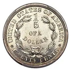 Pattern reverse designating the denomination as a fifth of a dollar. The obverse is the Seated Liberty, dated 1875.