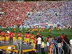 Starting in 2006, the coaches at the time, USC coach Pete Carroll and UCLA coach Karl Dorrell, expressed an interest in restarting the tradition of both teams wearing primary colored home jerseys. At the time, the NCAA football rules Article 3. a. stated, "Players of opposing teams shall wear jerseys of contrasting colors, and the visiting team shall wear white jerseys."[42] USC coach Pete Carroll said he would be willing to lose two timeouts during the game so that the USC team could wear their cardinal jerseys for the UCLA–USC football game on December 6, 2008.[43] It was determined before the 2008 game that the visiting school would only lose one timeout for incorrect equipment. Carroll agreed to forfeit a timeout to satisfy the ruling and Coach Rick Neuheisel agreed to forfeit one, in return (even though, as the coach of the home team, he was not required to do so by the ruling) to get back this tradition, and it was renewed in the 2008 game.[44] In the wake of the coaches' decisions, the NCAA decided to amend their rules regarding away teams' uniforms (which were originally put into place to provide more contrast for black-and-white photography and television broadcasts), changing the rule to state that the teams must agree on the decision for both teams to wear their colored jerseys before the game and that the uniforms must be of easily contrasted colors.[45][41] Since the home team is already required to wear its colored home jerseys and would not be in violation of any equipment rules, this essentially leaves the decision up to them as to whether or not to allow the visiting team is to wear their home uniforms.