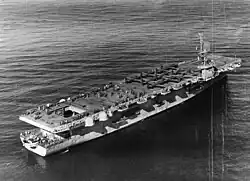 For the next twenty months, Windham Bay made nine round-trip transpacific resupply voyages, loading up at either San Francisco or San Diego, always unloading at Yokosuka, and always returning to San Francisco. She broke this routine in October and November 1952, when she visited Kaohsiung, Taiwan, and Bangkok, Thailand, before returning via Japan to Alameda on 9 December. Windham Bay continued her transpacific resupply voyages between the West Coast and Japan throughout 1953. As the Korean War wound down to an armistice, her transport missions began to involve more stops and side trips, notably to Hawaii, the Philippines, and to other Japanese ports besides Yokosuka. French Indochina became a frequent destination, with Windham Bay stopping at the capital of Saigon in May 1954, February 1955, and in March 1955, which by then had become part of the Republic of Vietnam. On 12 June 1955, she was reclassified as a utility carrier, with the hull symbol CVU-92. On 4 August 1956, she was severely damaged by a fire which broke out whilst she was docked in Alameda.[14] In May 1957, she added Naha, Okinawa to her list of ports of call, and in December 1957, she made another stop to Saigon. In all other respects, Windham Bay's career as a transport carrier during this period consisted solely of missions resupplying aircraft from the West Coast to Japan, conducted in support of the fast carriers assigned to cover the western Pacific.[7]