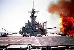Still assigned to TF 59, Wisconsin departed Ulithi on 14 March bound for Japan. Their mission was to neutralize or destroy aircraft, their airfields and warships that could interfere with the invasion of Okinawa (Operation Iceberg) that was scheduled for 1 April.[27] On 24 March, the ship joined Missouri and New Jersey as they bombarded targets in southeastern Okinawa to deceive the Japanese about the location of the intended landing beaches, which were actually on the western coast. Five days later, a crewman aboard Missouri was wounded by a 20 mm shell from Wisconsin as a Japanese aircraft flew between the ships at low level.[28][29]