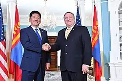 The Prime Minister's visit to the United States of America in September 2018 elevated the cooperation levels between the two countries to expanded comprehensive partnership.[20] This paved the way for Mongolia and the US to become strategic partners a year later.[21] During the historic visit Khürelsükh met the Secretary of State Michael Pompeo to ink the $350 million Millennium Challenge Corporation Mongolia Water Compact.[22]