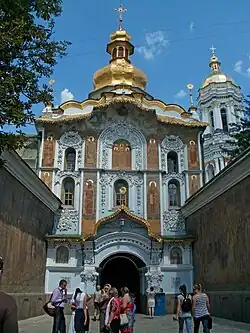 Ukrainian Baroque is distinct from the Western European Baroque in having more moderate ornamentation and simpler forms, and as such was considered more constructivist. Many Ukrainian Baroque buildings have been preserved, including several buildings in Kyiv Pechersk Lavra and the Vydubychi Monastery in Kyiv. The historian Andrew Wilson has identified All Saints' Church, the Cathedral of the Assumption and the Trinity Gate within the Kyiv Pechersk Lavra as good examples of the style, along with St. Michael's Golden-Domed Monastery in Kyiv and St. Catherine's in Chernihiv.[4] The exterior of St. Sophia Cathedral in Kyiv also underwent significant alterations in the Baroque style.[5] Another example of the style is the Church of St. Elias in Subotiv, where Bohdan Khmelnytsky buried his son Tymish in 1653 after his death in battle.[6] The church is also depicted on the ₴5 note.