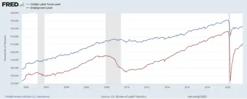 - Civilian employment, one measure of the size of the employed workforce, expanded consistently during the 1990s, but was inconsistent during the 2000s due to recessions in 2001 and 2008–2009. From 2010 onward, it steadily rose through October 2017.[45] For example, employment did not recover its January 2001 peak of 137.8 million until June 2003. Then, from the bubble-assisted peak in November 2007 of 146.6 million, 8.6 million jobs were lost due to the global economic crisis, with employment falling to 138.0 million. U.S. employment began rising thereafter and regained the pre-crisis peak by September 2014. By December 2016, civilian employment was 152.1 million, 5.5 million above the pre-crisis level and 14.1 million above the trough. By October 2017, 153.9 million were employed.[46]