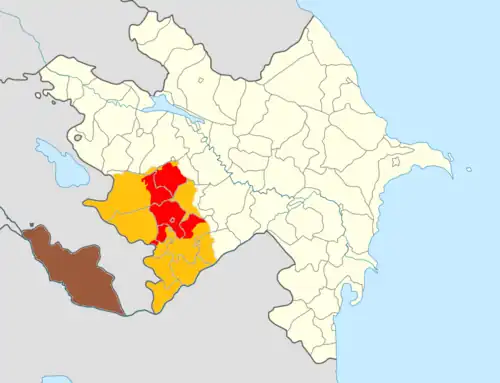 In the aftermath of the First Nagorno-Karabakh War, the Nagorno-Karabakh Republic, supported by the Republic of Armenia, took control over the territory of some 11,500 km2,[118] including several districts outside of the originally claimed borders of the Nagorno-Karabakh Autonomous Oblast of the Azerbaijani SSR, creating a "buffer zone".[119][96] Kelbajar and Lachin districts guarantee solid land corridor between Armenia proper and Nagorno-Karabakh.[120][96] Between 500,000 and 600,000 Azerbaijanis were displaced from the area.[121][122] In the meantime, almost all Armenians from Azerbaijan (between 300,000 and 400,000)[123][124] and Azerbaijanis from Armenia (over 150,000) were forced to move to their respective countries as remaining in their homes became nearly impossible since tensions between the two groups have grown worse since the start of the conflict in 1988.[125][126][127]