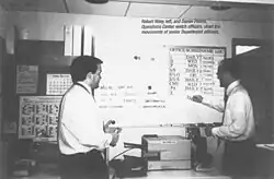 The Operations Center was inaugurated in 1961 at the instruction of President John F. Kennedy with Theodore C. Achilles as its first director.[4] When the President could not reach anyone at State in the midst of the failed Bay of Pigs invasion, he realized the importance of maintaining a crisis response center.[5] At its inception, only one watch officer staffed the Operations Center supplied with a GI-issue bunk bed, a water pitcher, and a telephone. Since then, the Operations Center has grown with the needs of the Secretary of State and the expanding U.S. diplomatic presence around the world. The Operations Center is made up of two parts: The Watch and Crisis Management Support.