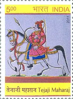 Veer Tejaji (29 January 1074 - 28 August 1103)[1] also known as Tejaji Maharaj, or simply Tejaji, was a great warrior, social reformer, cow protector and folk-deity in Rajasthan. In rural parts of northern Rajasthan, he is revered as a deity and is considered to be one of Lord Shiva's eleven primary incarnations.[2][3] He is mainly worshipped in the states of Rajasthan, Madhya Pradesh, Haryana, Uttar Pradesh, and Gujarat.[4] He is commonly known as the God of Snakes in Rajasthan, because it protect against snake bites or also worshipped as Dhauliya Veer.[5][6]