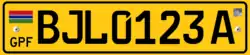 52 cm x 11 cm Black on yellow Gambian Flag as well as the text GPF on the top left corner of the license plate |