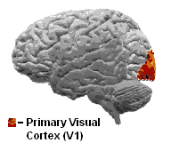 ![]() View of the brain from behind. Red = Brodmann area 17 (primary visual cortex); orange = area 18; yellow = area 19 | |