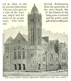 The small congregation moved north in Upper Manhattan. Upon moving to the Upper West Side, one wealthy new pastor (from 1879), Anson Phelps Atterbury (1855–1931), proposed a grand church in the hopes that the congregation would expand along with the rest of the neighborhood.[4] That pastor commissioned Leopold Eidlitz to build a diminutive midblock brick Romanesque Revival chapel in 1884, a style Eidlitz described as "muscular" Romanesque and considered appropriate to an evangelical Protestant church.[5][6][7] After a further $100,000 was raised, the main sanctuary was built in 1889–90 on the abutting corner site, to designs by Henry Franklin Kilburn in intricately carved brown and red sandstone in a stylistic continuation of Eidlitz's Romanesque chapel but re-cladding that brick chapel in sandstone and adding an offset diminutive tower.[1] The corner features a giant ribbed bell-domed belltower, which dominates the neighborhood and if not for the competing heights of apartment towers "would be one of the West Side's loveliest landmarks," according to the AIA Guide to NYC.[8]