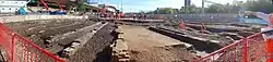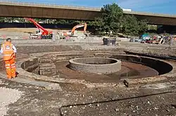 Royal Oak, another station on the Circle and Hammersmith & City lines, was also once served by the GWR, but its services were withdrawn in 1934.[14] Today, the first stop away from Paddington is at Acton Main Line. Industrial archaeologists have found the remains of buildings including a broad gauge train shed for Brunel's original lines, a turntable, and engine sheds in excavations east of the station as part of the land clearance work for the Crossrail project.[15]