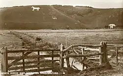 According to local tradition,[3] the current white horse was cut in 1778 by a Mr Gee, who overlaid a smaller, older chalk figure, believed to also have been a horse, the only surviving image of which dates to 1772, and shows a figure facing the other way with a long tail. During the 19th and early 20th Centuries the figure was periodically reshaped and repaired.[3]