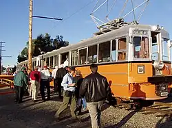 left: Birney streetcar and right: San Francisco Municipal Railway Magic Carpet Streetcar 1003: trolleys with motormen and visitors, 2006.