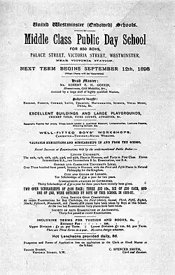 The charters and foundations of several historic charity schools[3] were by Act of Parliament in 1873 incorporated into the Grey Coat Hospital Foundation and United Westminster Schools (UWS) Foundation. UWS comprised the Westminster City School and Emanuel School, Wandsworth; the Grey Coat Hospital Foundation comprised the Grey Coat Hospital, Westminster and Queen Anne's School, Caversham. In 1910, the Worshipful Company of Clothworkers transferred the Sutton Valence School in Kent into UWS.[4] [5] Westminster City School is amalgamation of the former Brown Coat, Green Coat and Black Coat schools. Key dates in its history are:[5]