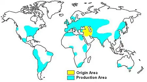 Origin and 21st century production areas of wheat