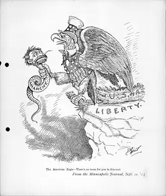 Hanna, on McKinley's behalf, met with the eastern Republican political bosses, such as Thomas Platt of New York and Senator Matthew Quay of Pennsylvania, who were willing to guarantee McKinley's nomination in exchange for promises regarding patronage and offices. McKinley, however, was determined to obtain the nomination without making deals, and Hanna accepted that decision.[87] Many of their early efforts were focused on the South; Hanna obtained a vacation home in southern Georgia where McKinley visited and met with Republican politicians from the region. McKinley needed 453½ delegate votes to gain the nomination; he gained nearly half that number from the South and border states. Platt lamented in his memoirs, "[Hanna] had the South practically solid before some of us awakened."[88]