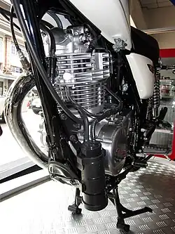 The SR400 has an air-cooled 4-stroke single cylinder SOHC 2-valve engine with a dry-sump, with the downtubes of the motorcycle's frame serving as the engine's oil reservoir and cooling system,[6] thereby eliminating the need for an external oil cooler, reducing engine pumping losses, and allowing increased ground clearance as well as reduced overall width. The bike's semi-double cradle frame uses high-strength steel.[6]