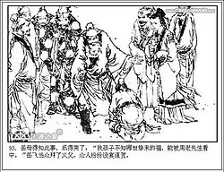 Zhou continued to teach the children until his death, prior to Yue's legal adulthood.[25] Following his passing, Yue became extremely depressed since Zhou had been the greatest influence on his early life.[30] Zhou's student would regularly visit his tomb on the first and fifteenth of every month with sacrifices of meat and wine and would shoot three arrows in succession with one of the two bows his tutor had presented him with (it is never mentioned whether any of Zhou's other archery pupils came to visit his tomb).[32] Dr. Kaplan comments that this continuous unusual display of mourning "went far beyond the ceremonial appropriate for even a highly respected teacher".[30] Noted Sinologist Hellmut Wilhelm claims even though the display of grief was genuine, it was also a way of emulating the stories of his heroic idols and "[establishing himself] in the public eye".[25] Yue's father later followed him secretly to Zhou's tomb after striking him during an argument over his melancholic behavior. There, he saw him perform the unorthodox obediences involving the meat, wine, and three arrows. When he finally confronted him, the son confessed that "his gratitude for Chou's instruction could not be requited simply by the usual first and middle of the month ceremonies and so he ... shot off the three arrows to symbolize that Chou had been the source of his inspiration as an archer".[33] Dr. Kaplan's states this happened just prior to Yue's entrance into the army and that the entire event served as a symbol for Yue's "entrance into responsible manhood".[33]