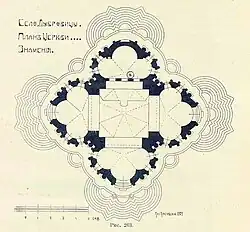 The central part of the church has the shape of a regular square, to which semicircular parts adjoin on all sides; the eastern part as an altar, and the other three are porches. Semicircles are decorated with columns with Corinthian capitals – not of the classical form, but freely stylized. The central part is connected to the altar and the porches by arched spans, turning its walls into four pylons. The first floor is built on a high foundation; the church also has a semi-basement. Around the church, repeating the outline of its plan, there is an open terrace fenced with a parapet.[13]